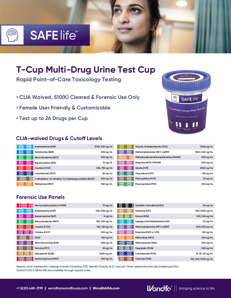 The SAFElife™ T‑Cup Multi‑Drug Urine Test Cup is a fast, reliable, and user-friendly drug testing solution designed for rapid point‑of‑care testing. This CLIA‑waived and FDA‑cleared product offers testing for up to 26 drugs in a single test cup. It is ideal for use in Medication-Assisted Treatment (MAT) Clinics, ensuring compliance and safety for patients. The T‑Cup features adulteration tests (Creatinine, Specific Gravity (SG), and pH) and is available in customizable panels to meet specific needs.