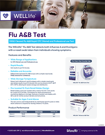 The WELLlife™ Flu A&B Test is a rapid, easy-to-use immunochromatographic assay designed for the qualitative detection of Influenza A and Influenza B antigens from respiratory specimens. This test enables quick differentiation between flu strains, supporting timely diagnosis and appropriate treatment decisions. Engineered for accuracy and efficiency, WELLlife™ delivers reliable results within minutes, making it ideal for both clinical and point-of-care settings.